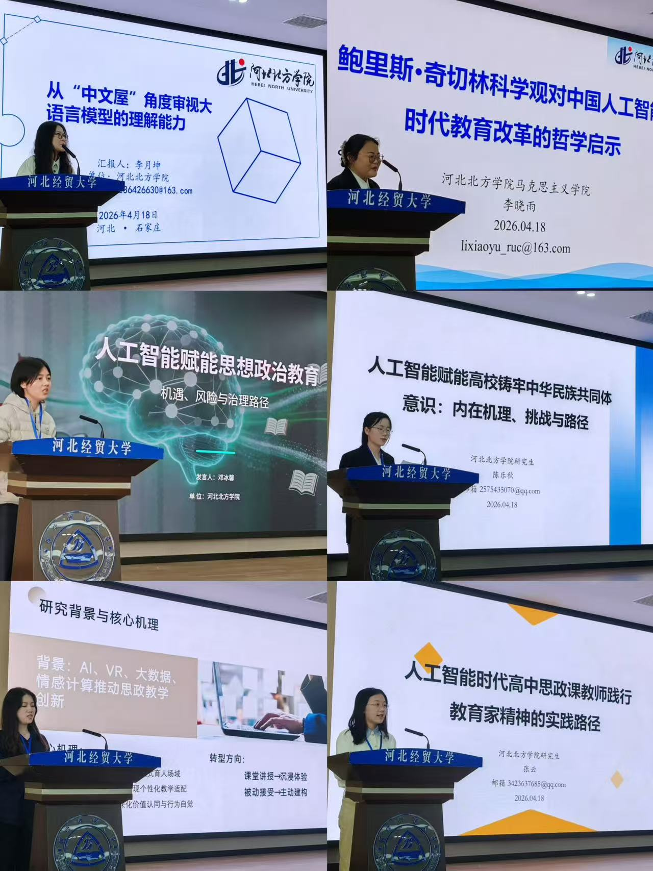 在主题发言阶段,太阳成集团tyc234cc师生围绕多个前沿课题分享研究成果,充分展现了公司青年教师的学术研究水平与人才培养成效。李月坤立足“中文屋”理论视角,深度探讨大语言模型理解能力的哲学内核;李晓雨细致分析并阐释了鲍里斯・奇切林科学思想对我国人工智能时代教育改革的重要启示;硕士研究生邓冰馨、陈乐秋、文璐瑶、张云分别围绕人工智能赋能思政教育提质增效、高校铸牢中华民族共同体意识、沉浸式思政教学优化路径、高中思政课教师践行教育家精神的实践路径等课题,分享最新研究思考,得到与会专家同行认可。